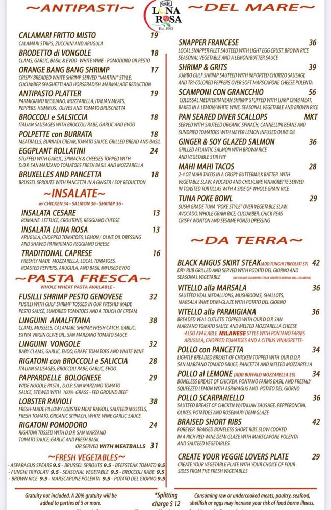 Introducing Caffe Luna Rosa, a delightful Italian eatery in Delray Beach, Florida. This charming spot offers a wide range of options, from antipasti to pasta fresca to insalate. The antipasto platter is a great start, featuring a variety of Italian meats and cheeses. The cheese ravioli pomodoro is a must-try, with a creamy parmigiano sauce. The linguini Amalfitana is a seafood lover's dream, packed with clams, mussels, shrimp, and fresh catch. The insalata cesare is a classic choice, while the traditional caprese salad is a fresh and tasty option. With a cozy atmosphere and friendly service, Caffe Luna Rosa is a must-visit for Italian cuisine lovers.
